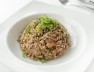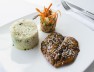 Steak de Atún, bañado en salsa teriyaki, acompañado de arroz saborizado con mantequilla, tomillo y vegetales salteados.